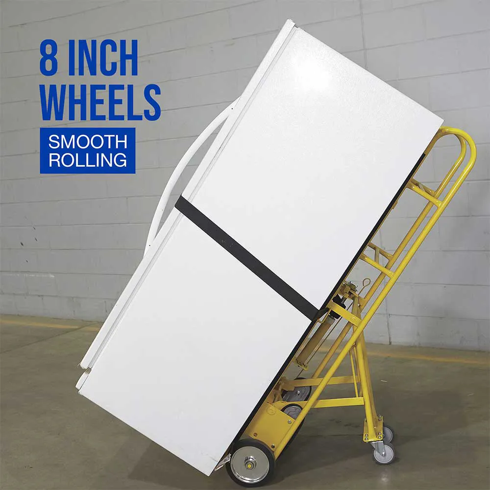 This heavy-duty Strongway 2-wheel appliance truck featuring kickback swivel wheels for support easily converts to a 4-wheel truck. Has exceptional stair climbing ability and includes easy auto-rewind ratchet belt tightening for secure cargo hold. Great for transporting vending machines, appliances, safes, furniture and other large items.